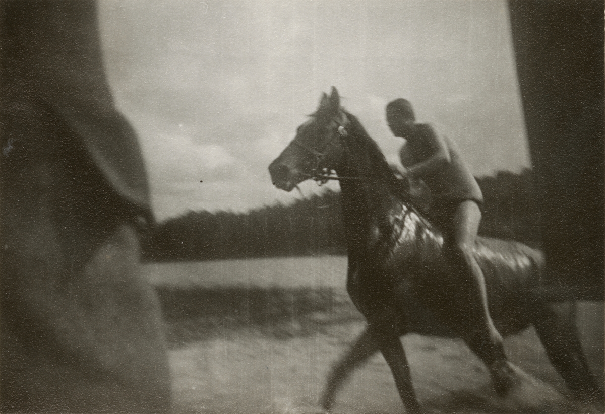 Titel: Text i fotoalbum: "Sommarmarschen 1937 till Varnum (norr Ulricehamn). Simning med häst".