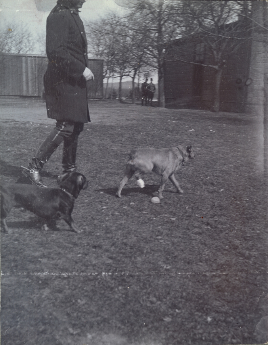 Titel: Text i fotoalbum: "Ränneslätt K 4 Kav. aspirantskola 1900". Soldat på promenad med två hundar.