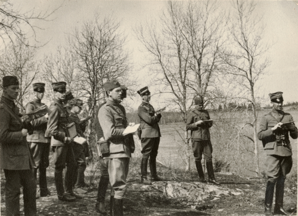 Titel: Text i fotoalbum: "AIHS fältövningar i Norrtälje 26-30 april 1938. Genomgång vid Harby."