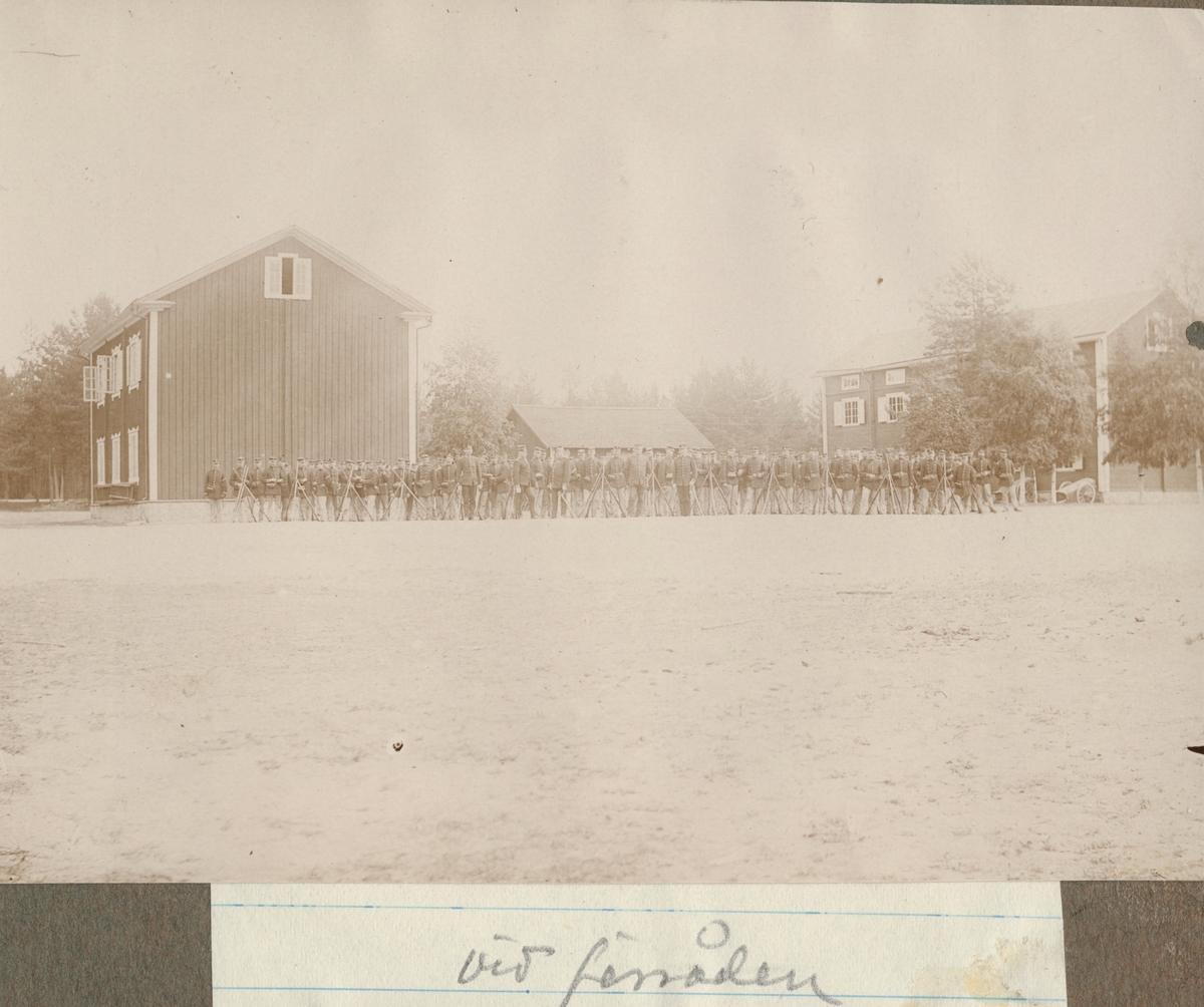 Titel: Soldater uppställda framför förrådsbyggnader på Hälsinge regementets övningsplats Mohed.
