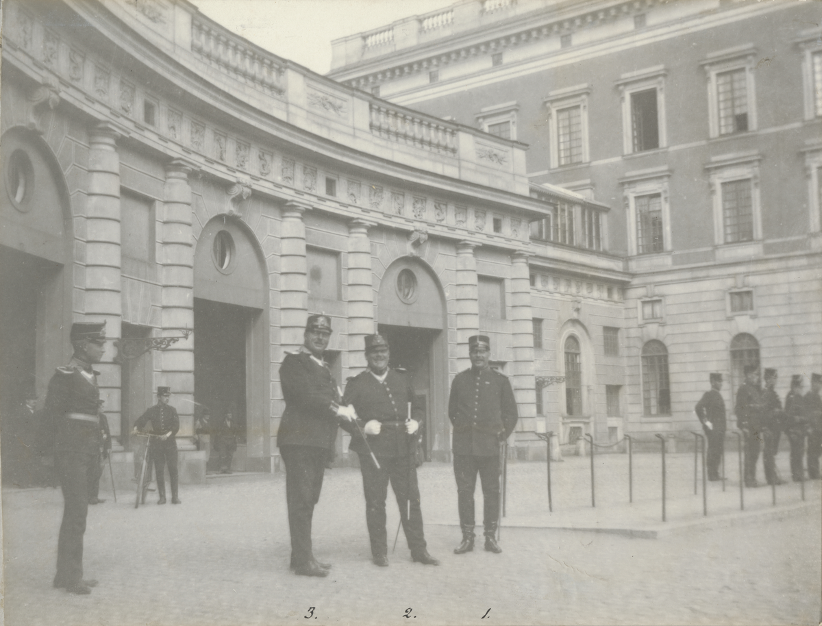 Titel: Text i fotoalbum: "Minnen från Storstrejkskommenderingen i Stockholm 1909. Högvakten på Kungl. Slottet."