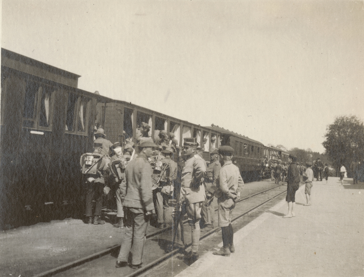 Titel: Truppförflyttning med tåg. Soldater stiger på tåget. På perrongen står barn och tittar på.