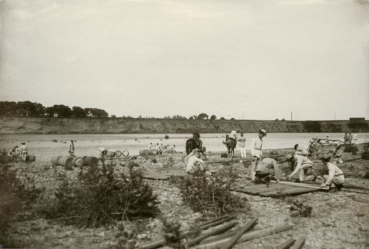 Titel: Elever från Krigsskolan Karlberg förbereder brobygge över vattendrag.