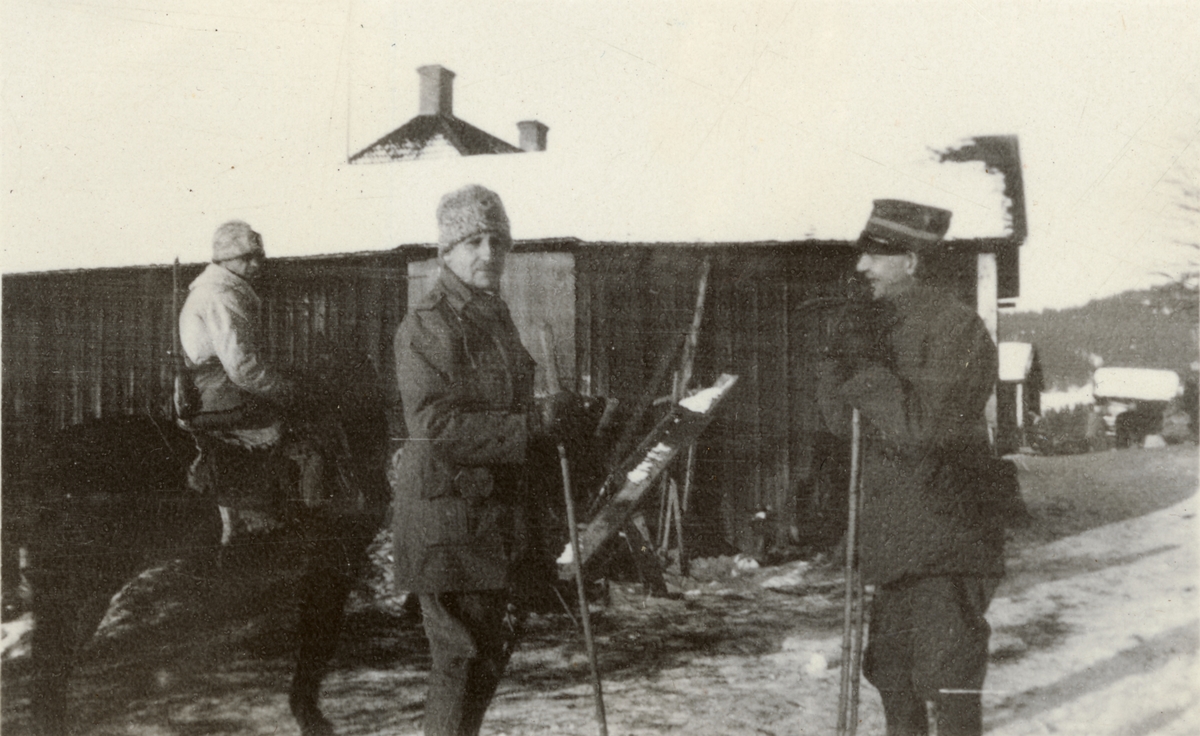 Text i fotoalbum: "Vinterövningar med plogkolonn. Befälet. v. Hejne, Persson".