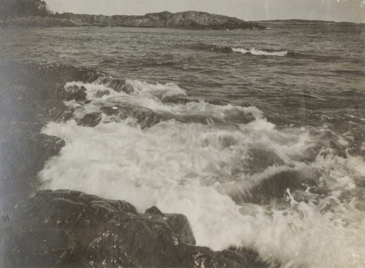 Titel: Naturbild på havet med vågor som slår mot strandklippor.