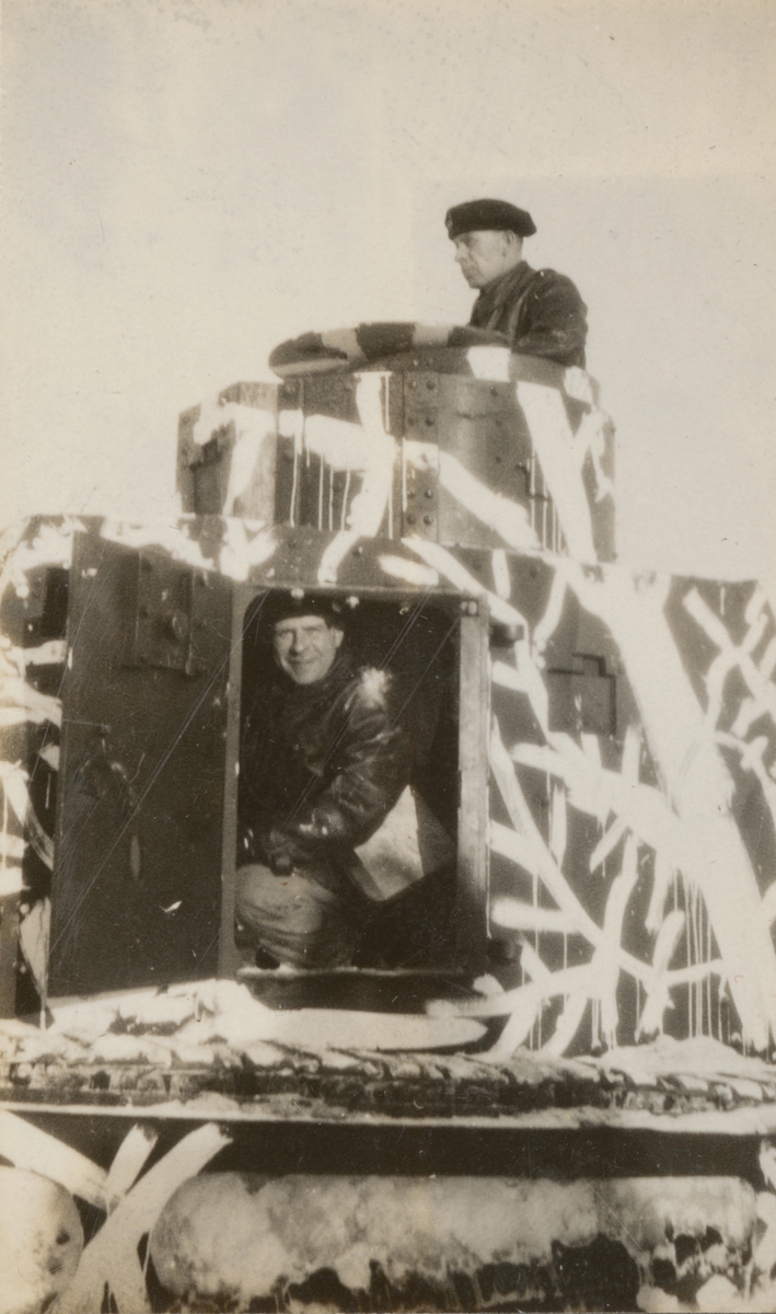 Kapten Gösta Bratt Hallands regemente I 16 och löjtnant Erik de Maré Dalregementet I 13 i stridsvagn m/1921 (eller m/1921-1929). Göta livgardes stridsvagnsbataljon på vinterövning i Boden.