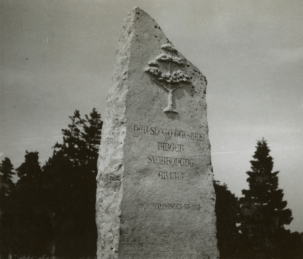 Text i fotoalbum: "I 5:s officersövningar på Gotland den 2.-10. juli 1924". Text i minnesten: "Här slogo gutarna Birger Sveakonung år 1313. Stenen restes år 1913".