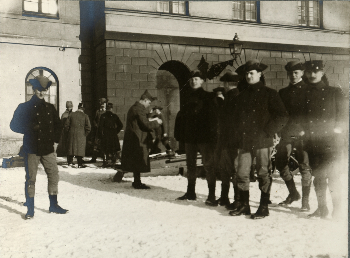 Titel: Gruppbild framför en byggnad på Storgatan 41 i Stockholm.