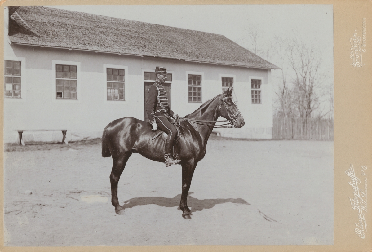 Porträtt av löjtnant Axel Nordlander vid Skånska husarregementet på olympiahästen Lady Artist. Olympisk guldmedaljör individuellt och i lagritt vid OS i Stockholm 1912.