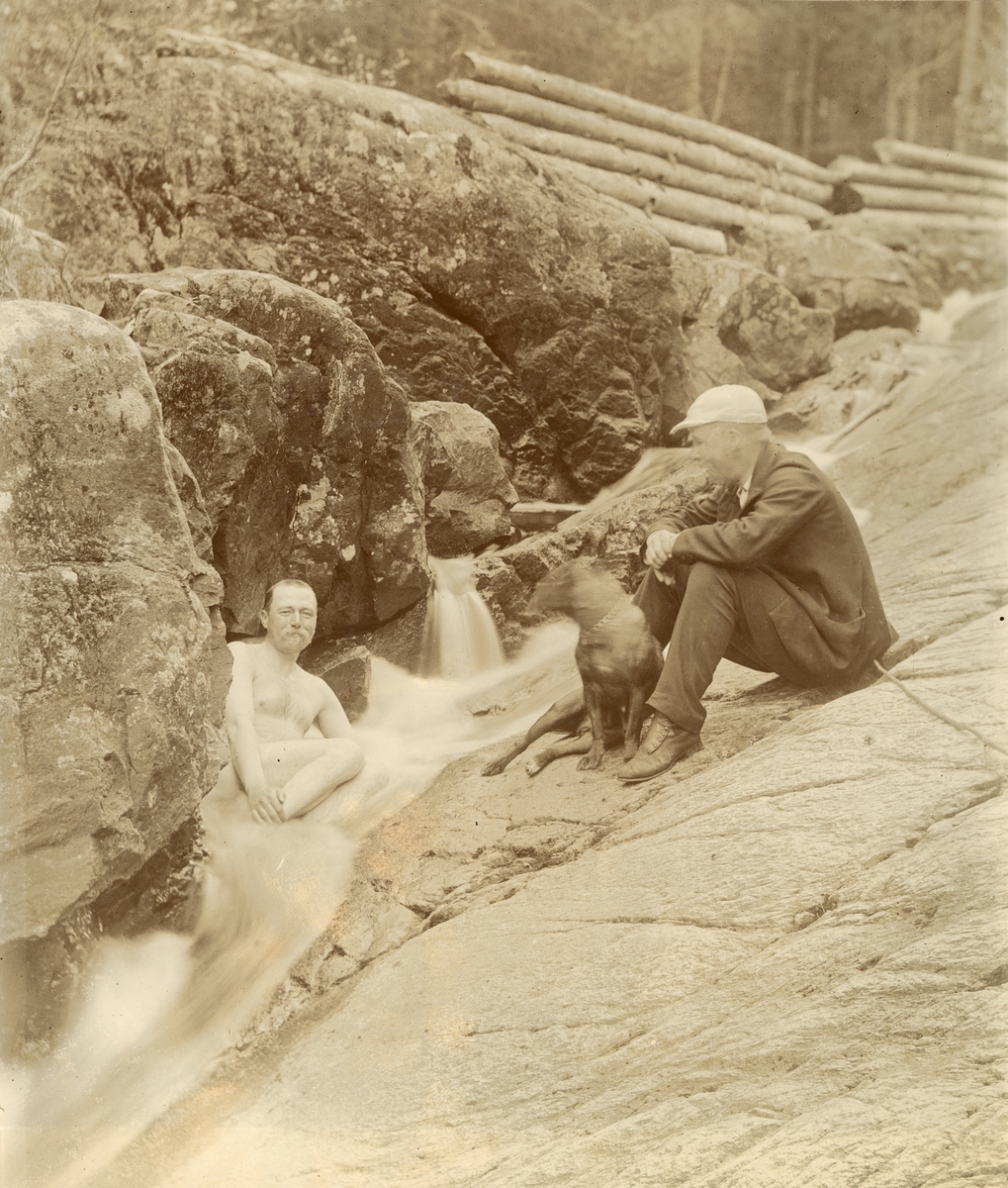 Titel: Två män vid ett vattendrag.