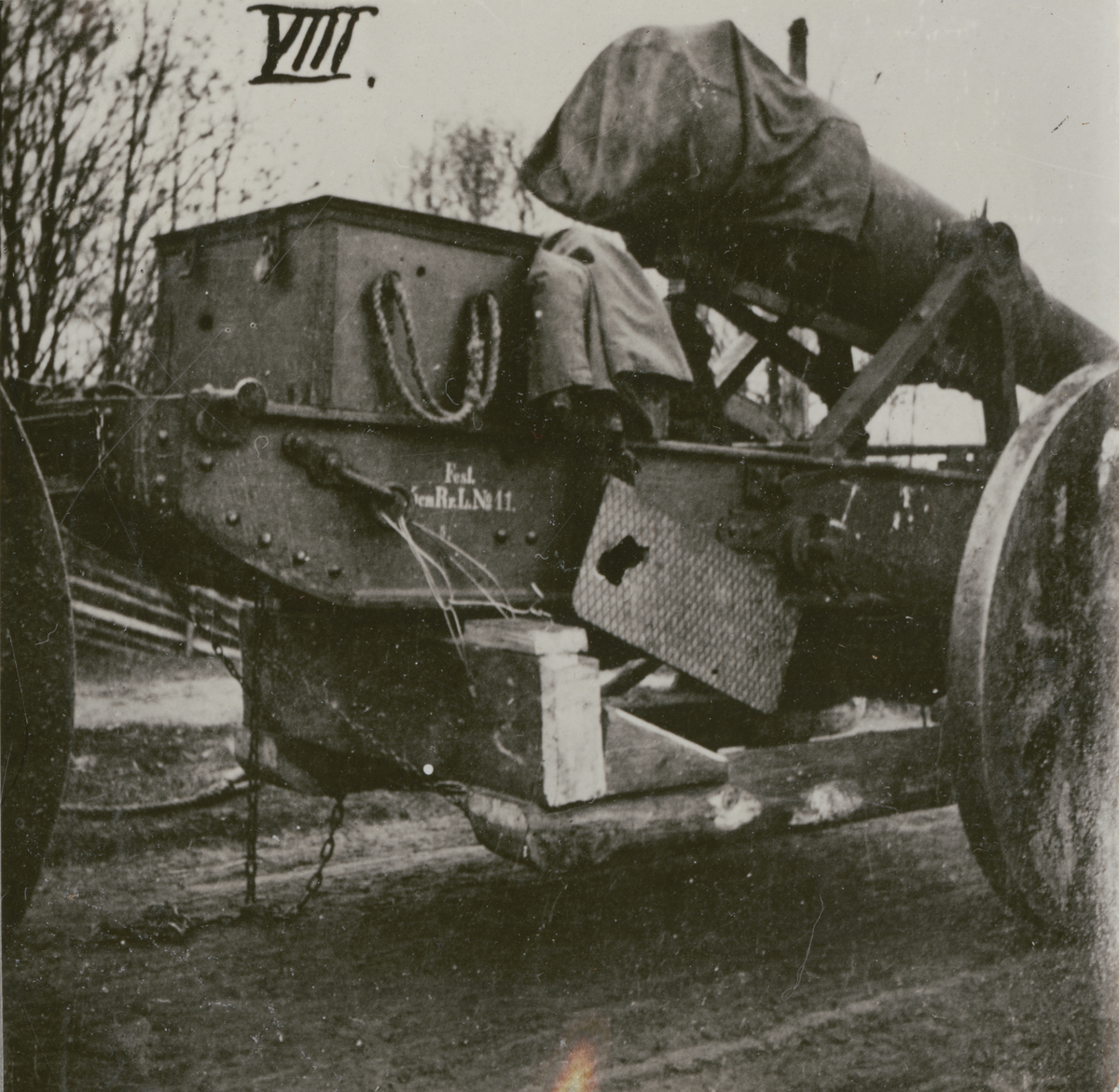 Titel: Text i fotoalbum: "Svårigheter vid transport af tungt artilleri på de bottenlösa ryska vägarna."