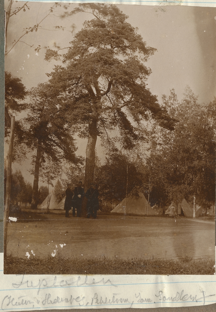 Fyra soldater från Hälsinge regemente vid en stor tall framför tältlägret vid Mohed. Från vänster regementspastor Hultin, kapten von Hedenberg, kapten Pihlström och löjtnant Sandberg.