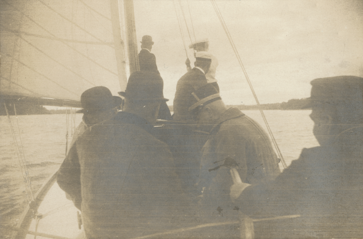 Titel: Text i fotoalbum: "Utanför Waxholm 1909 med kammarherre Leuhusens kutter."