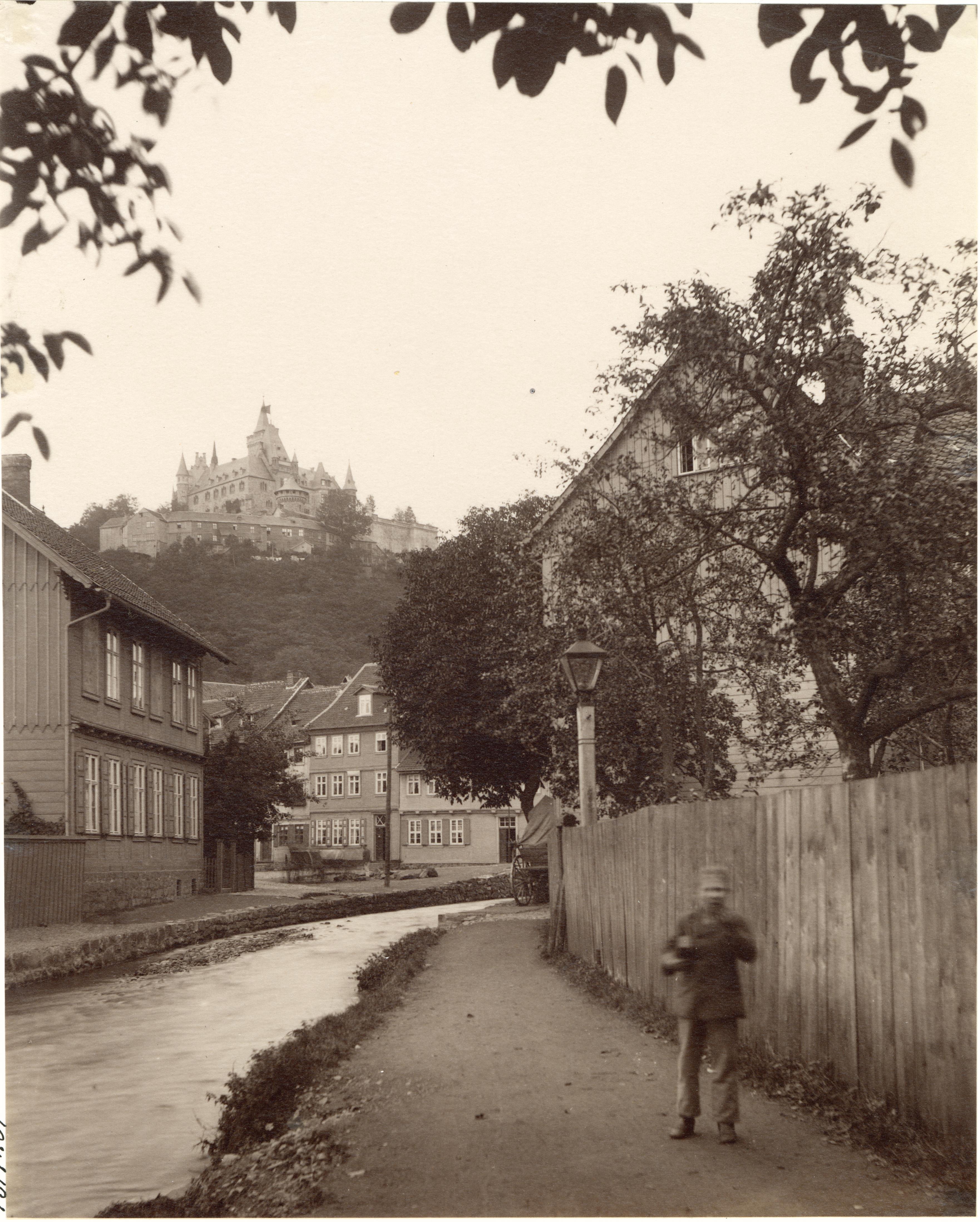 Gatan Schöne Ecke vid strömmen Zillierbach. Wernigerode slott i bakgrunden. Bilden troligen tagen 1885-1890.