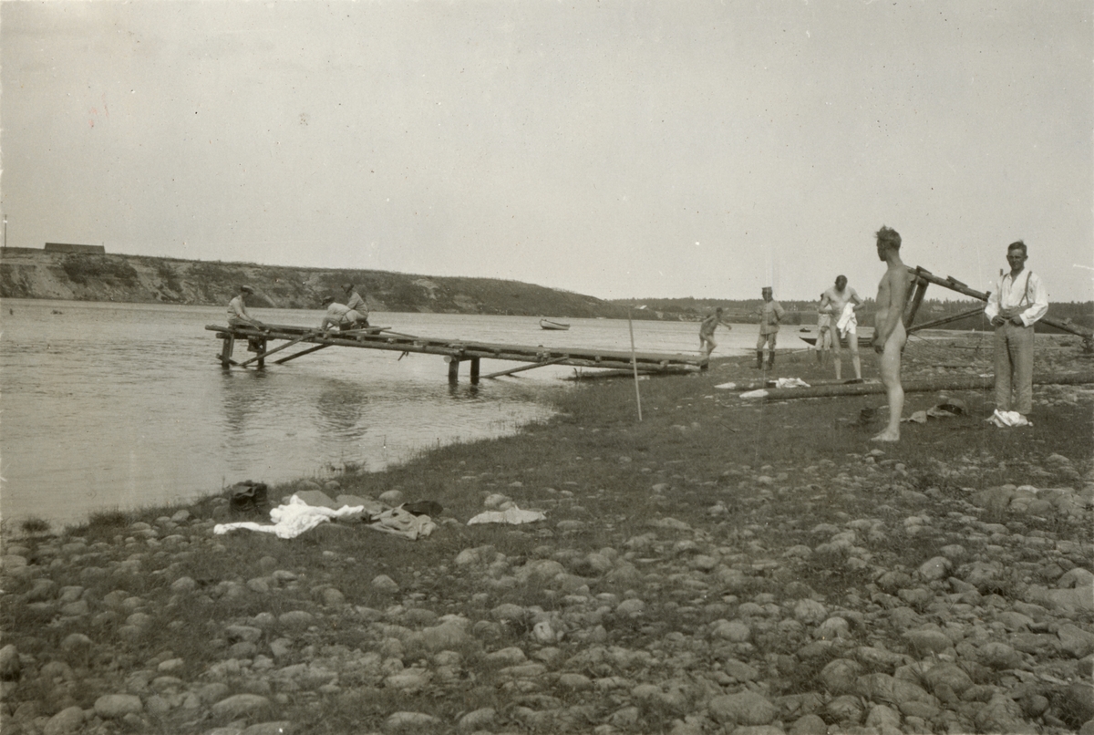 Titel: Elever från Krigsskolan Karlberg förbereder brobygge över vattendrag.