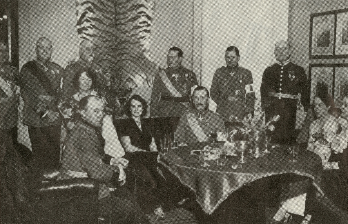 Text i fotoalbum: "Från vänster, stående: Generalerna Österman, Waldén, Ignatius, Hanell samt förf.; sittande: Generalskan Malmberg, Vita Gardets chef Överste Vihma, överstinnan Vihma, Fältmarskalken Mannerheim, Generalskorna Oesch och Ignatius".