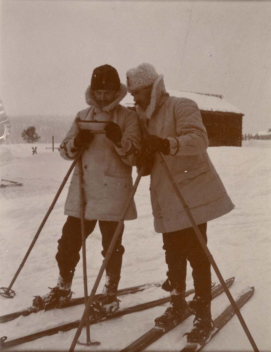 Officerare från Smålands husarregemente K 4 på skidor, vinterövning i Norrbotten omkring 1910.