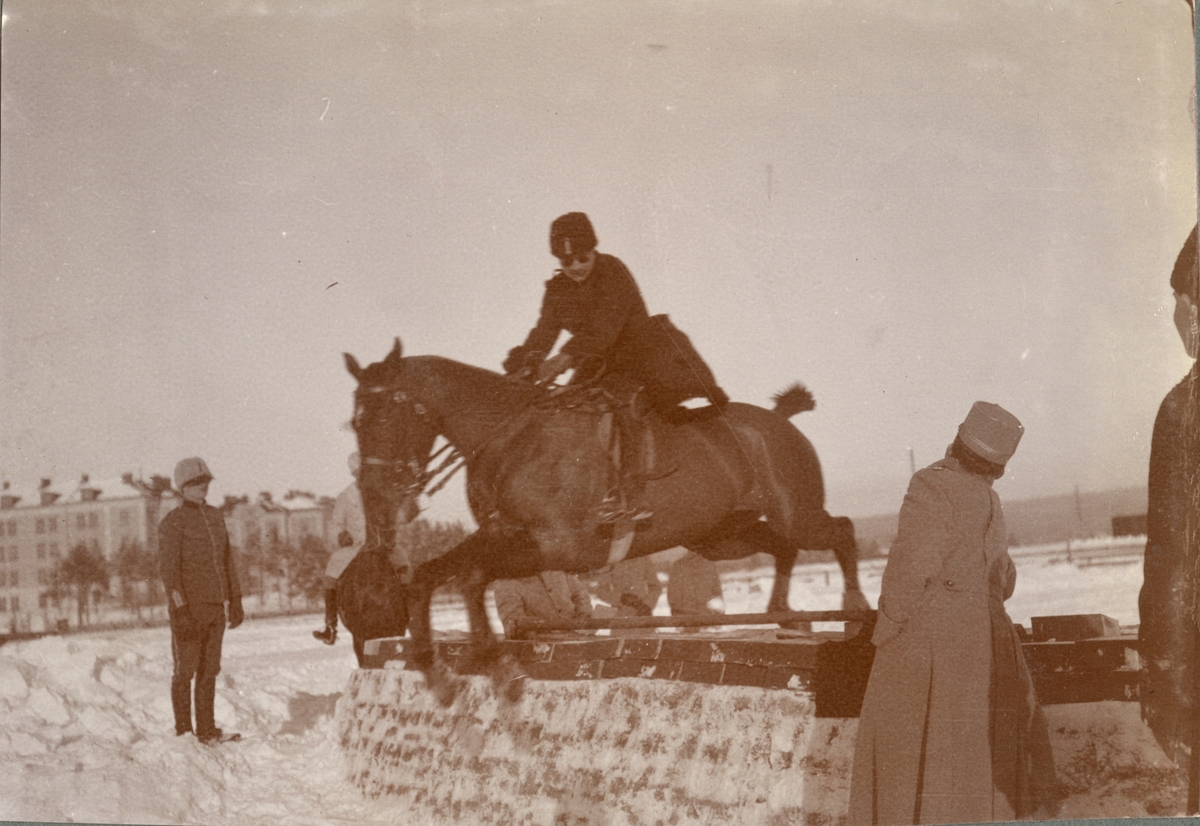 Titel: Text i fotoalbum: "Underofficersskolan 1911-1912 Umeå-Eksjö". Ridövning.