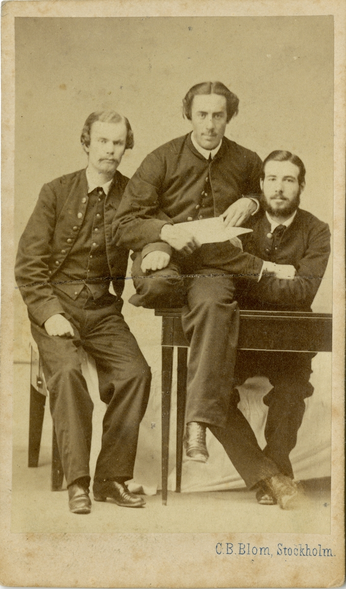 Porträtt av tre officerare, från vänster: Carl Gustaf Alexander Sederholm, officer vid Västgöta regemente I 6, Bror Johan August Lidman, officer vid Flottan och Carl Magnus Axel Wästfelt, officer vid Hälsinge regemente I 14.