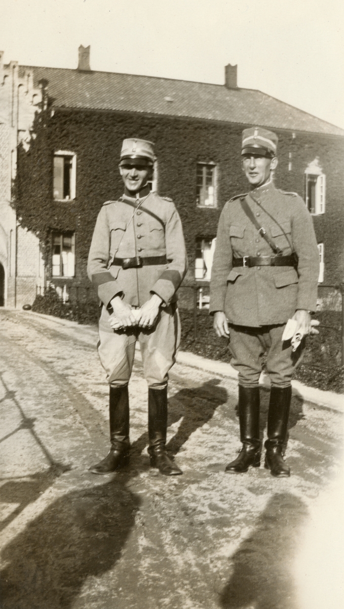 Titel: Text i fotoalbum: "Förbindelsekursen 1920". Porträtt med två soldater.
