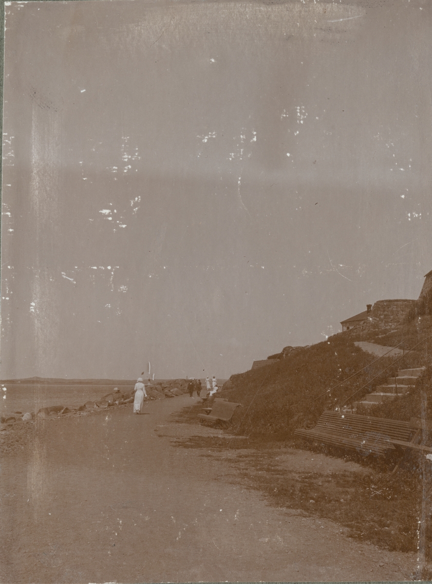 Titel: Kvinnor och män promenerar längs stranden. Till höger finns bänkar och stigen upp till Varbergs fästning.