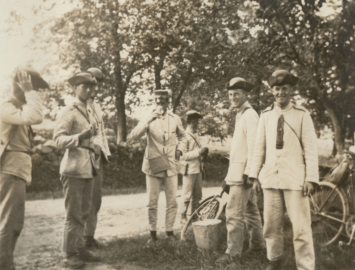 Titel: En grupp soldater har paus vid en vägren. Vägen kantas med en stenmur och träd.
