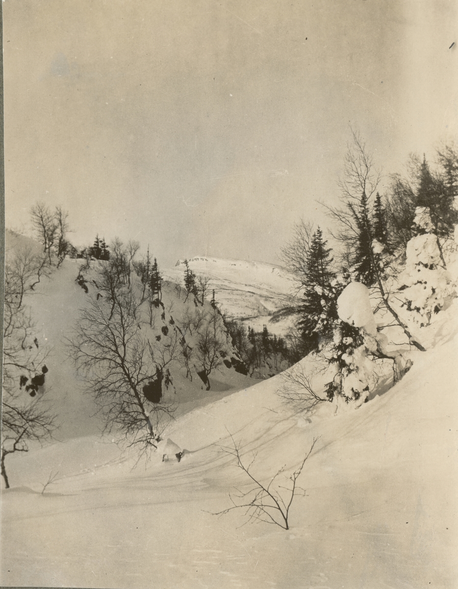 Titel: Ett snötäckt vinterlandskap med vy till en fjältopp genom ravin.