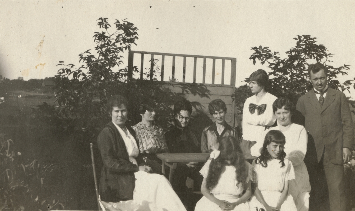 Titel: En grupp kvinnor i och en man trädgård.