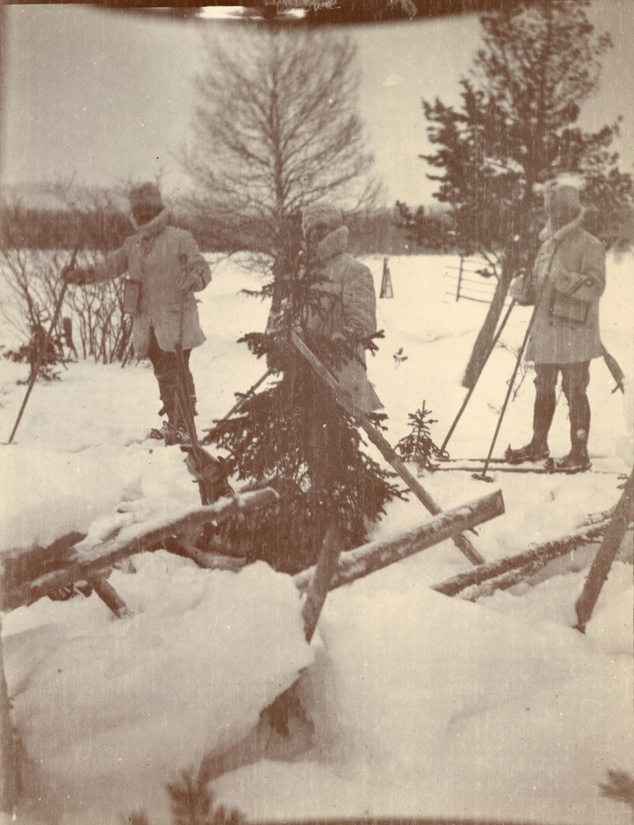 Titel: Officerare från Smålands husarregemente K 4 på skidor, vinterövning i Norrbotten omkring 1910.