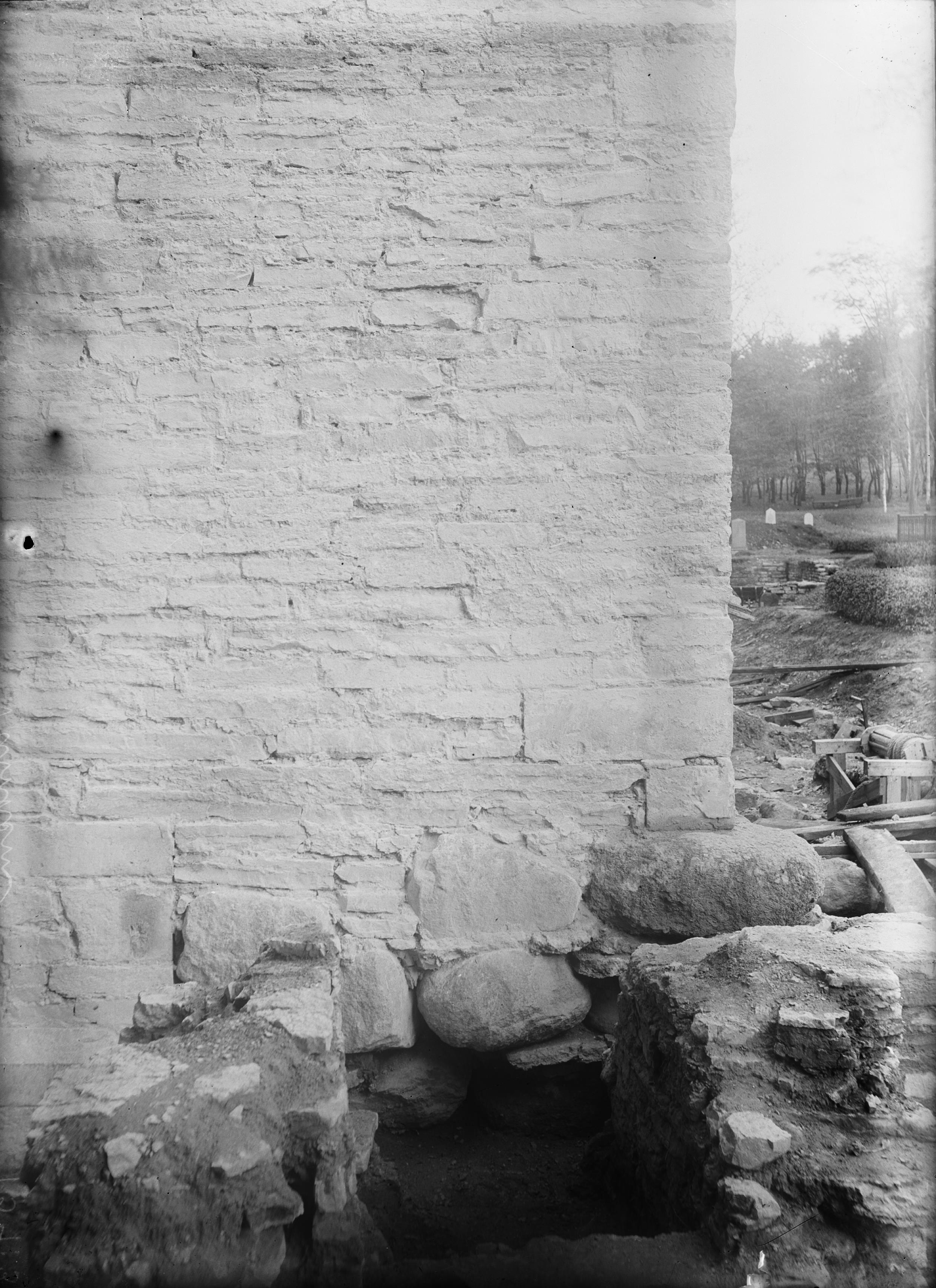 Södra fasaden, dess västligaste strävpelare från väster före genombrytningen.
