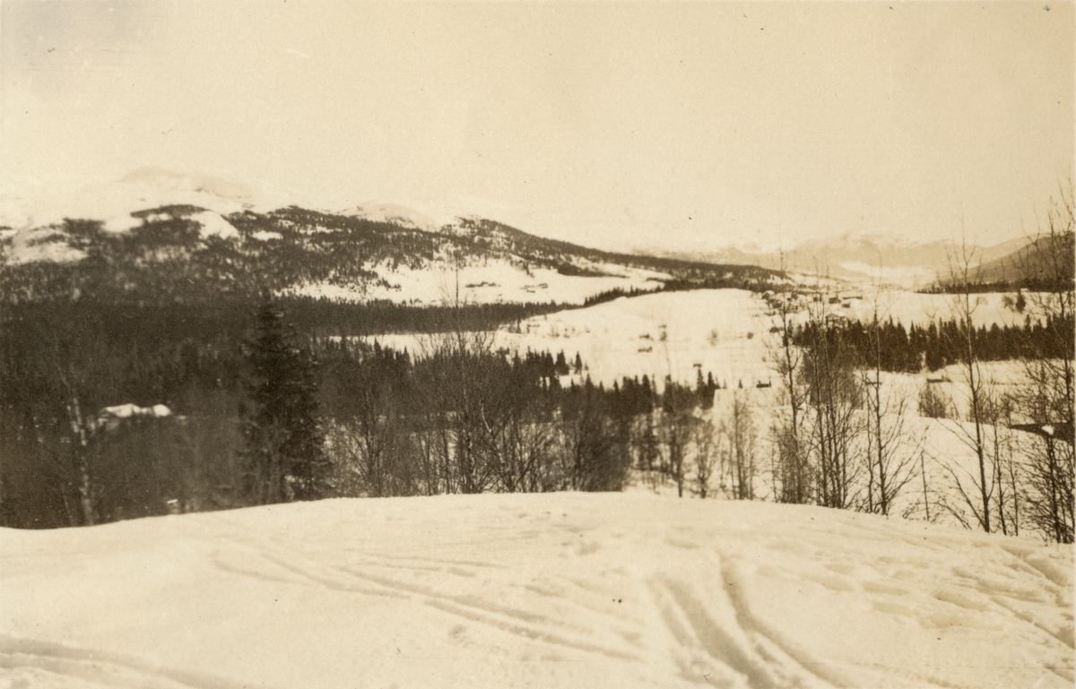 Text i fotoalbum: "Aspirantskolans vinterövningar i Björnänge febr.-mars 1926. En dag tolkade vi till Tännforsen och tillbaka. Karl XII:s monument i Duved och utsikten därifrån mot Åre".
