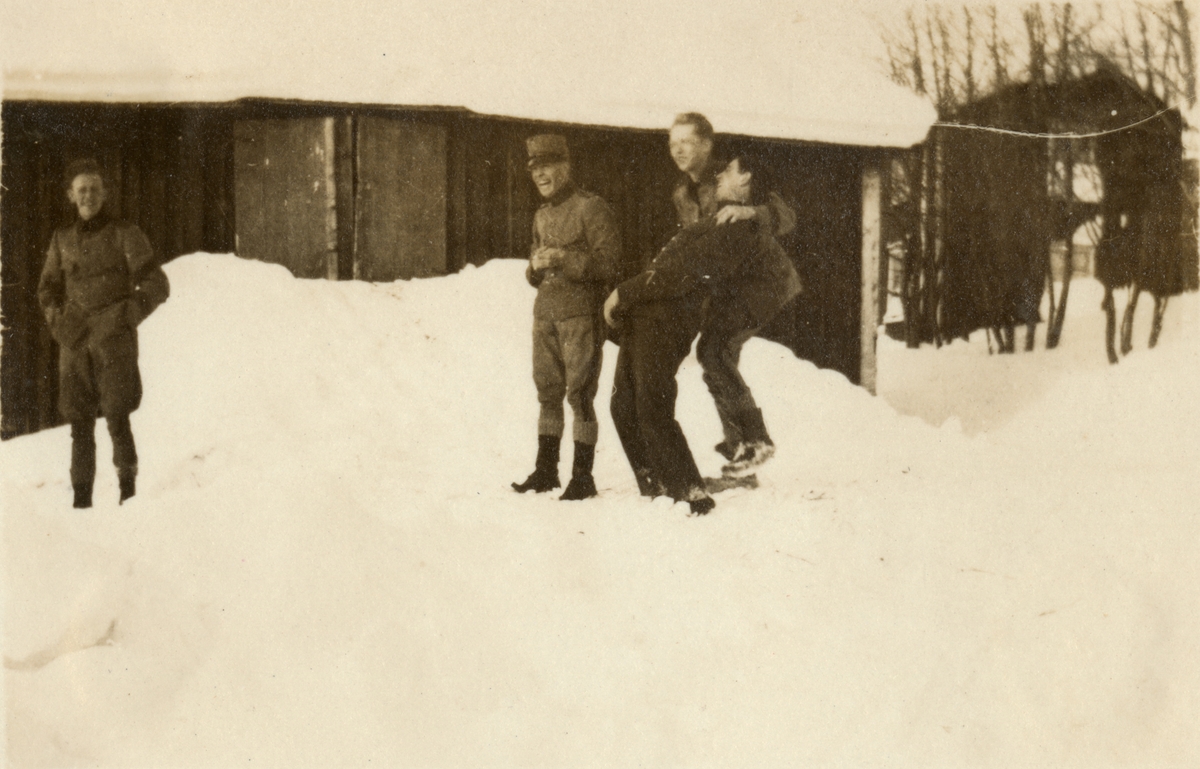 Text i fotoalbum: "Aspirantskolans vinterövningar i Björnänge febr.-mars 1926. "Ledighetskommitten" beskådar backåkningen ".
