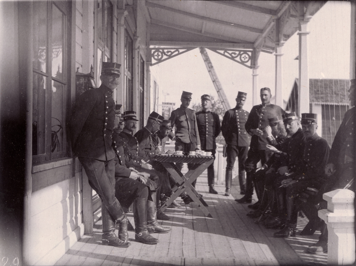 Text i fotoalbum: "Hietaniemi herrgård, efter lunchen. Sundin, Carleson, de Champs, Söderhjelm, Törnell, Lagercrantz, Lie."
