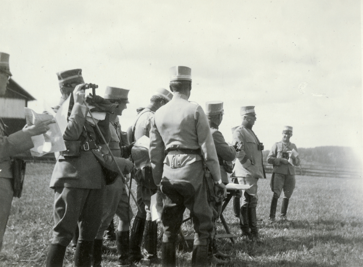 Titel: Text i fotoalbum: "Förbindelsekursen 1920". Soldater på övningsplats.