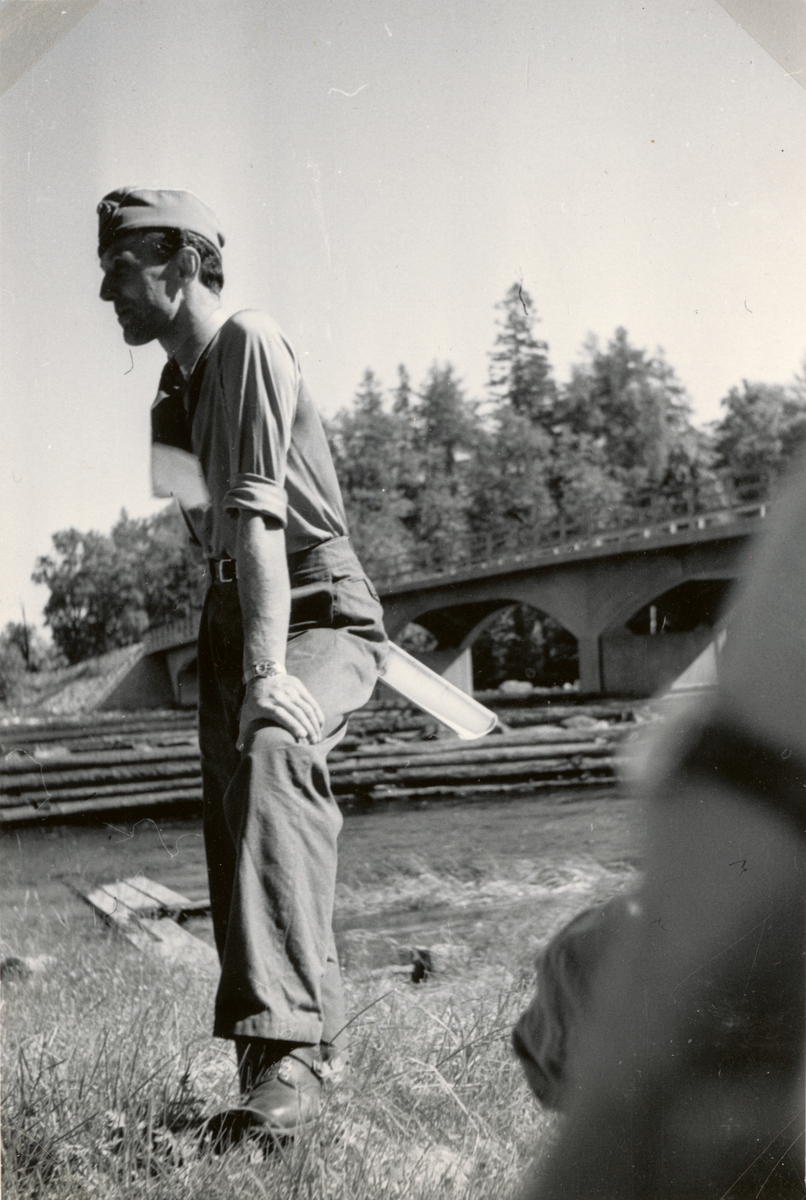 Titel: Text i fotoalbum: "Min sista Hk-kurs på ingfältövning juli 1946. 1. läraren har genomgång".
