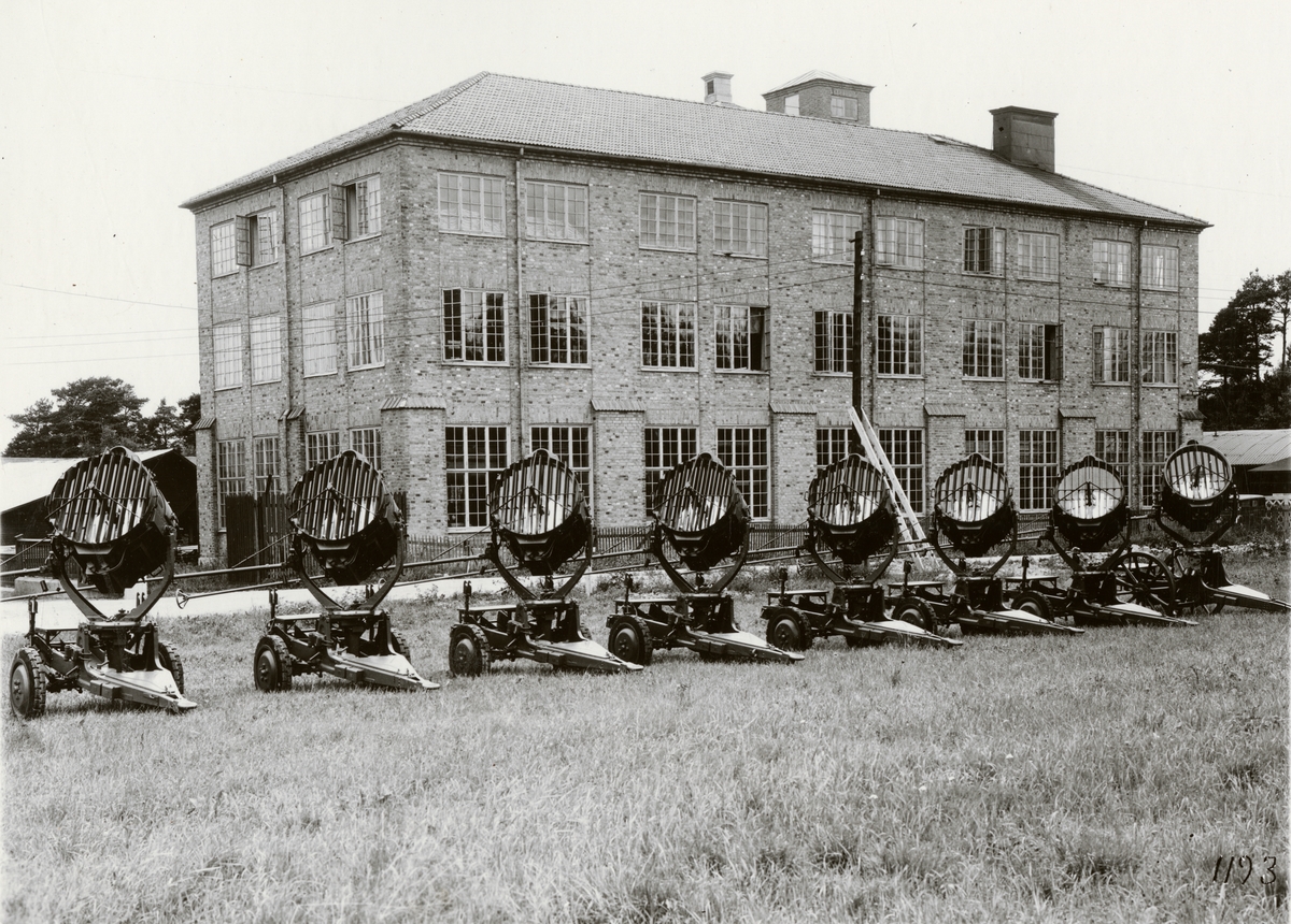 Strålkastare med 90 cm spegeldiameter, högeffektlampa och lavett med skivhjul, typ OH, lysläge. Tillverkad av Svenska Instrument Aktiebolaget (SIA).