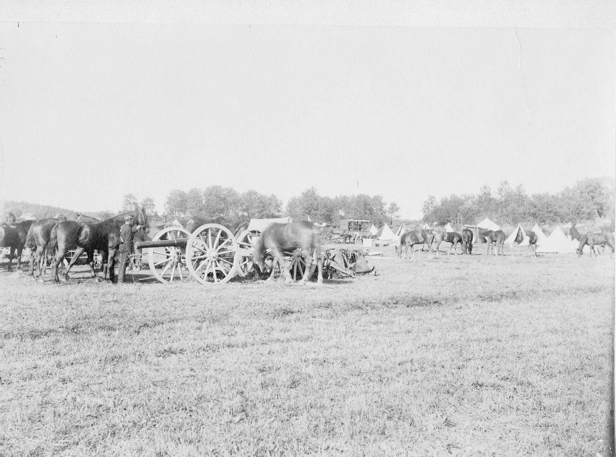 Skånska dragoner i bivack, tält och lösgående och avsadlade hästar. I förgrunden en 8,4 cm kanon m/1881.