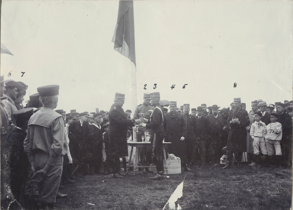 Titel: Text i fotoalbum: "Öfverste Kniberg delar ut pris å Karlsborg 1907 till löjtn Schreber A 6."