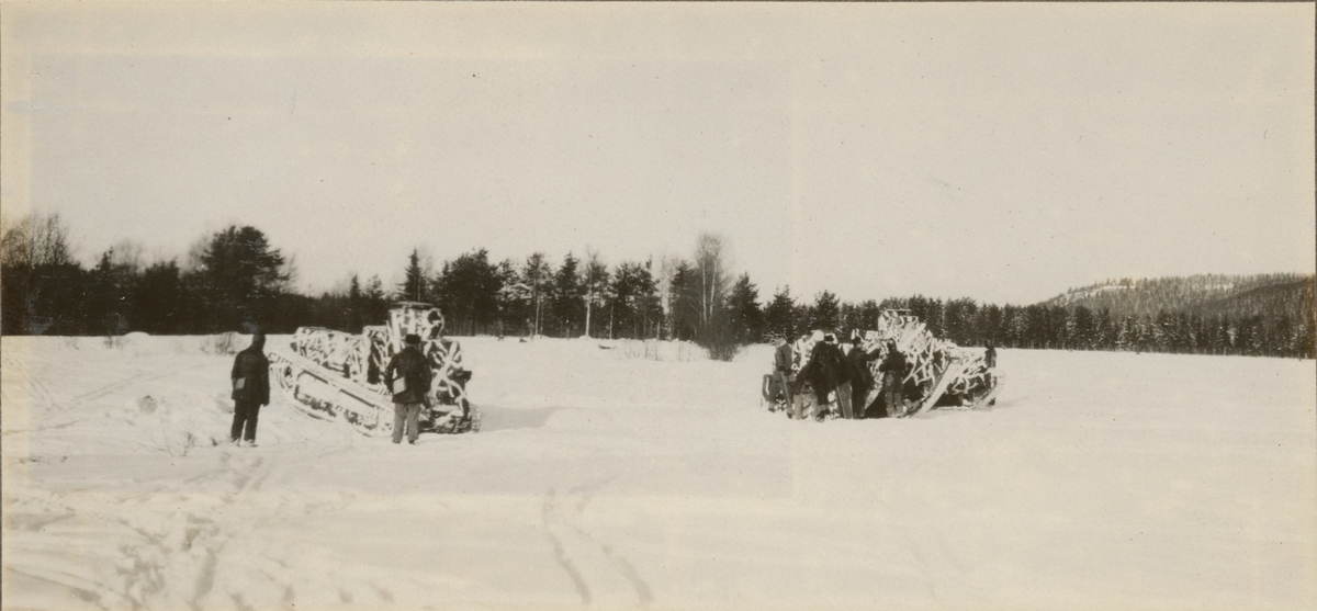 Titel: Två kamouflerade stridsvagnar i vinterlandskap med soldater samlade runt omkring.