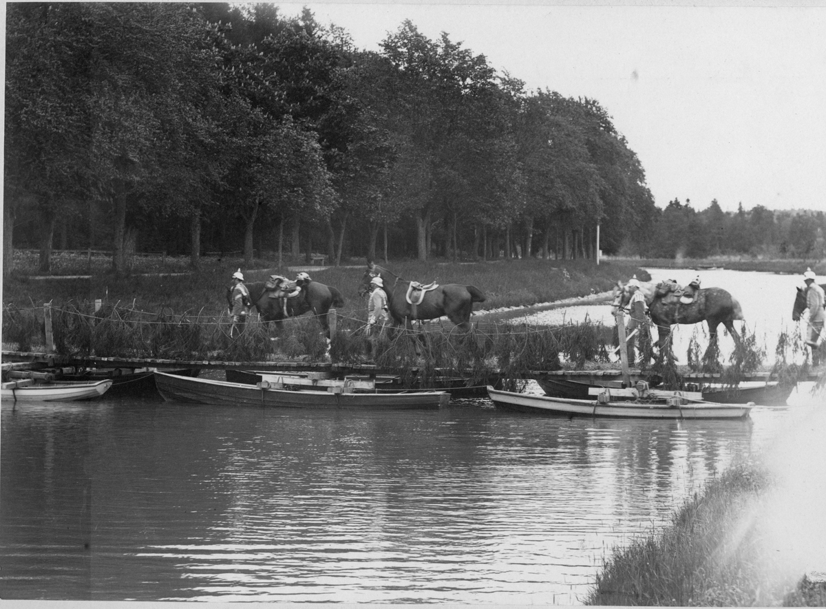 Soldater ur Livregementet till häst K 1,leder hästar på smal bro över Djurgårdsbrunnskanalen.