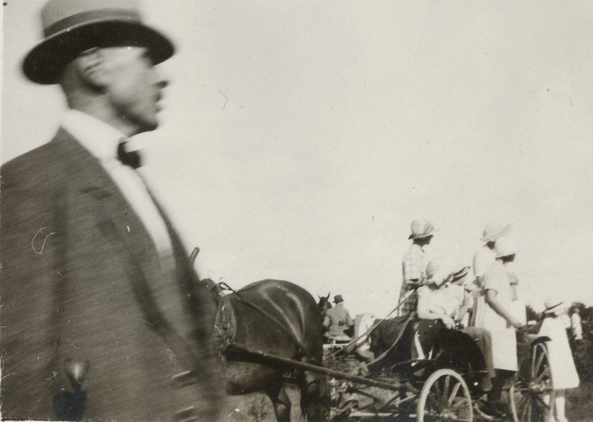Titel: Civila kvinnor och män bland hästar och vagn.