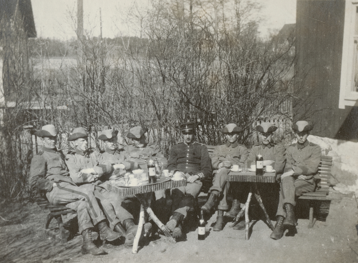 Titel: Gruppbild av soldater från Göta livgarde I 2 på en uteservering.
