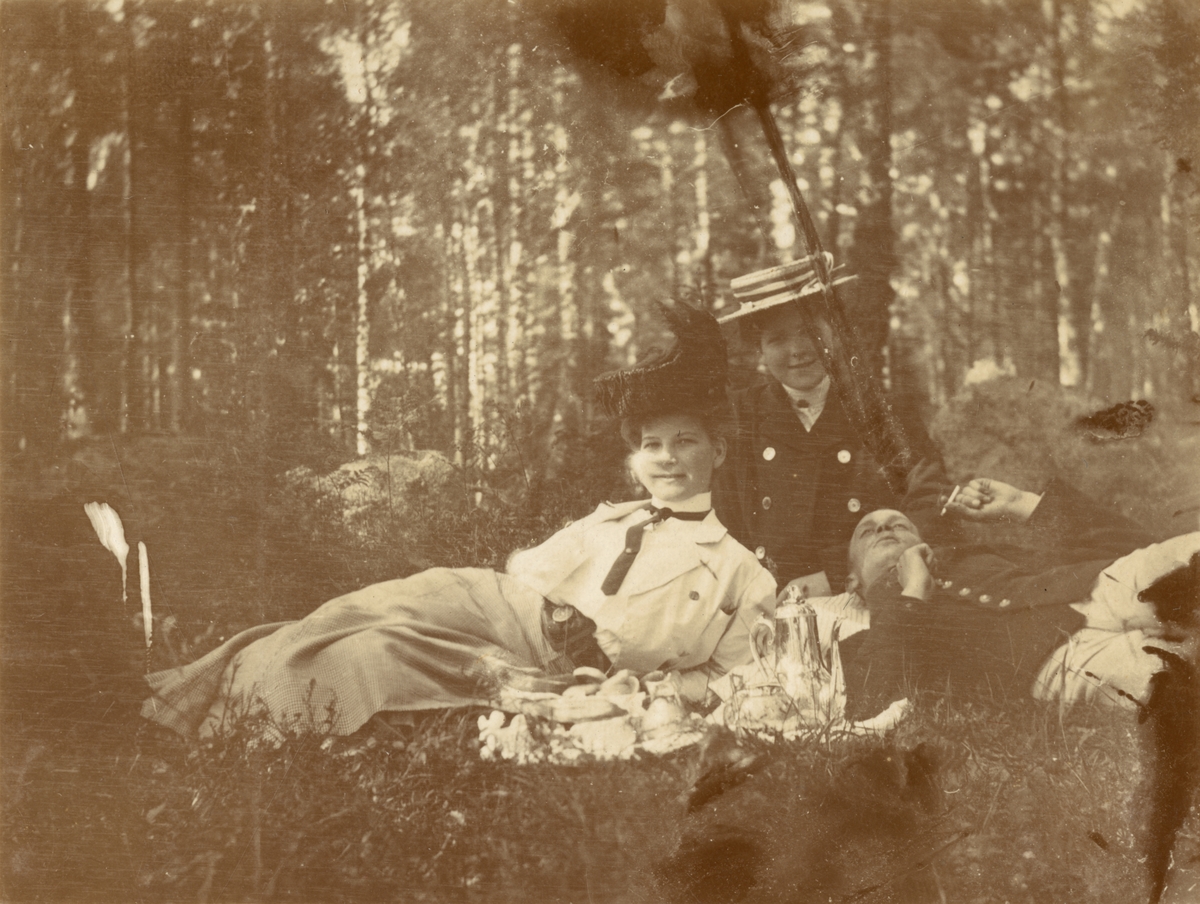 Titel: Två unga kvinnor och en soldat i en skogsbacke.