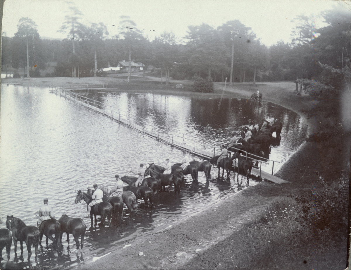 Titel: Text i fotoalbum: "Ränneslätt K 4 Kav. aspirantskola 1900". Soldater till häst vid vattenled.