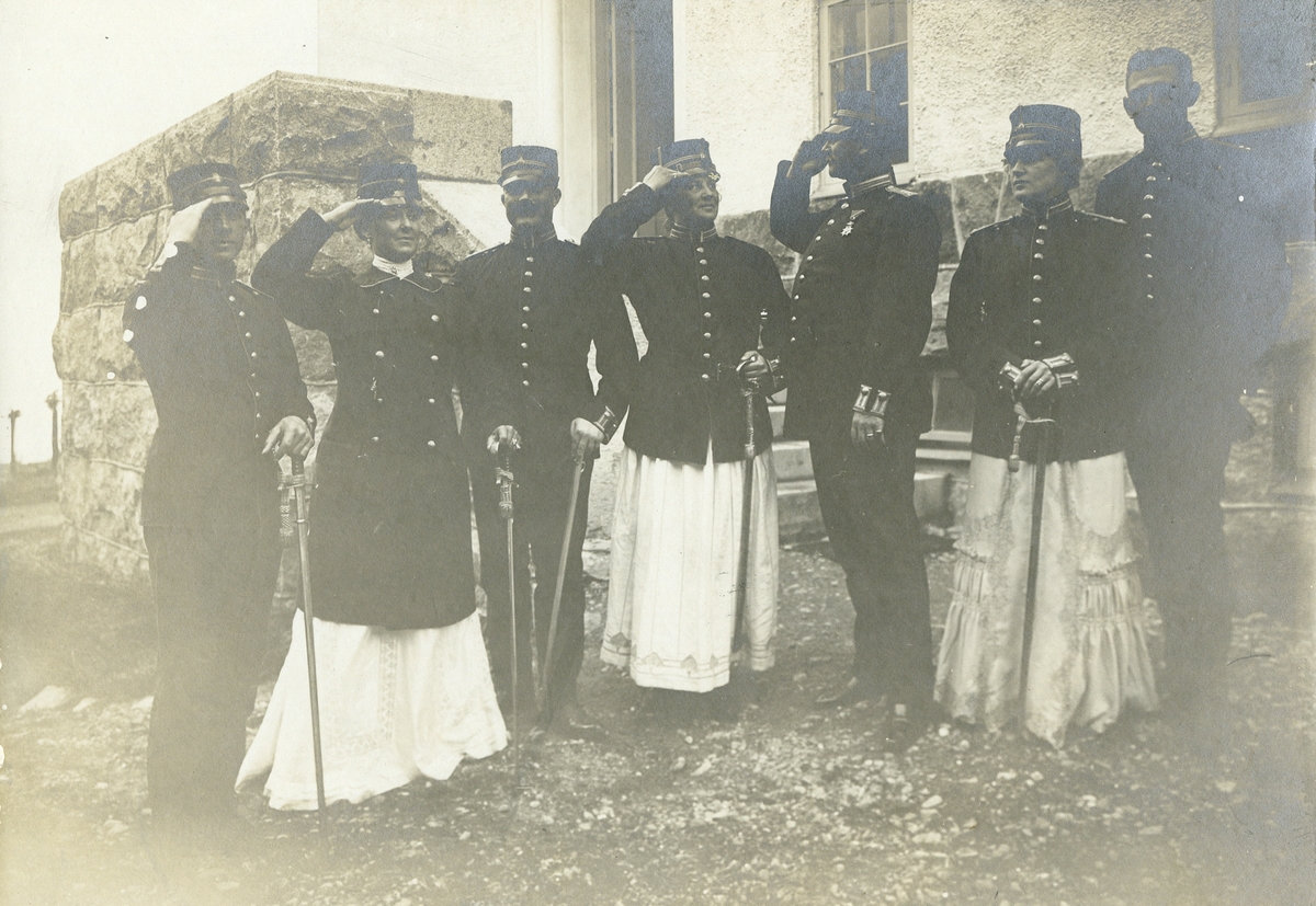 Officerare vid Norra skånska infanteriregementet I 24 med damer i klänningar och uniformsrockar.