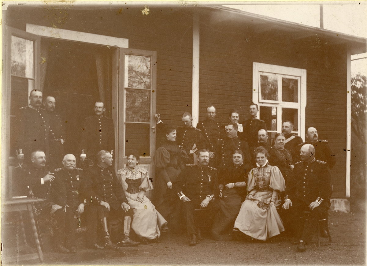 Titel: Grupporträtt av officerare vid Västmanlands regemente I 18 med damsällskap på Salbohed.