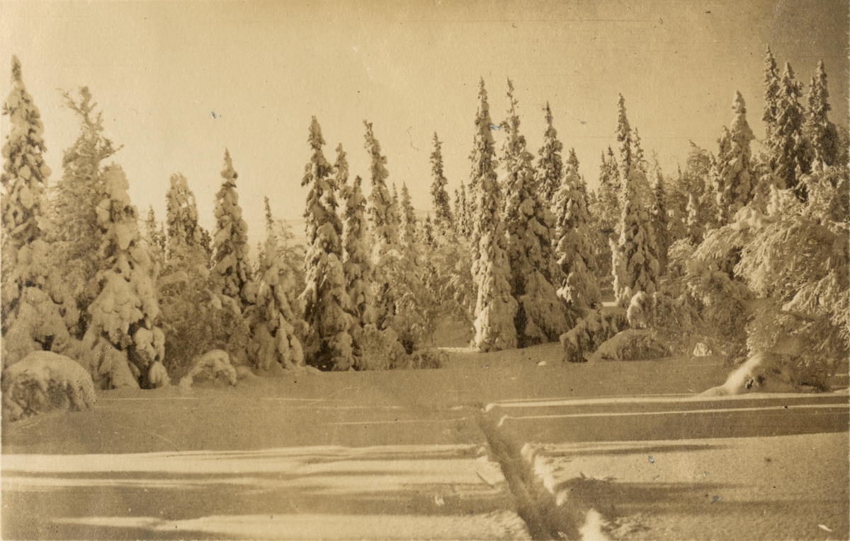 Text i fotoalbum: "Aspirantskolans vinterövningar i Björnänge febr.-mars 1926. Skogsterrängen ovanför gården".