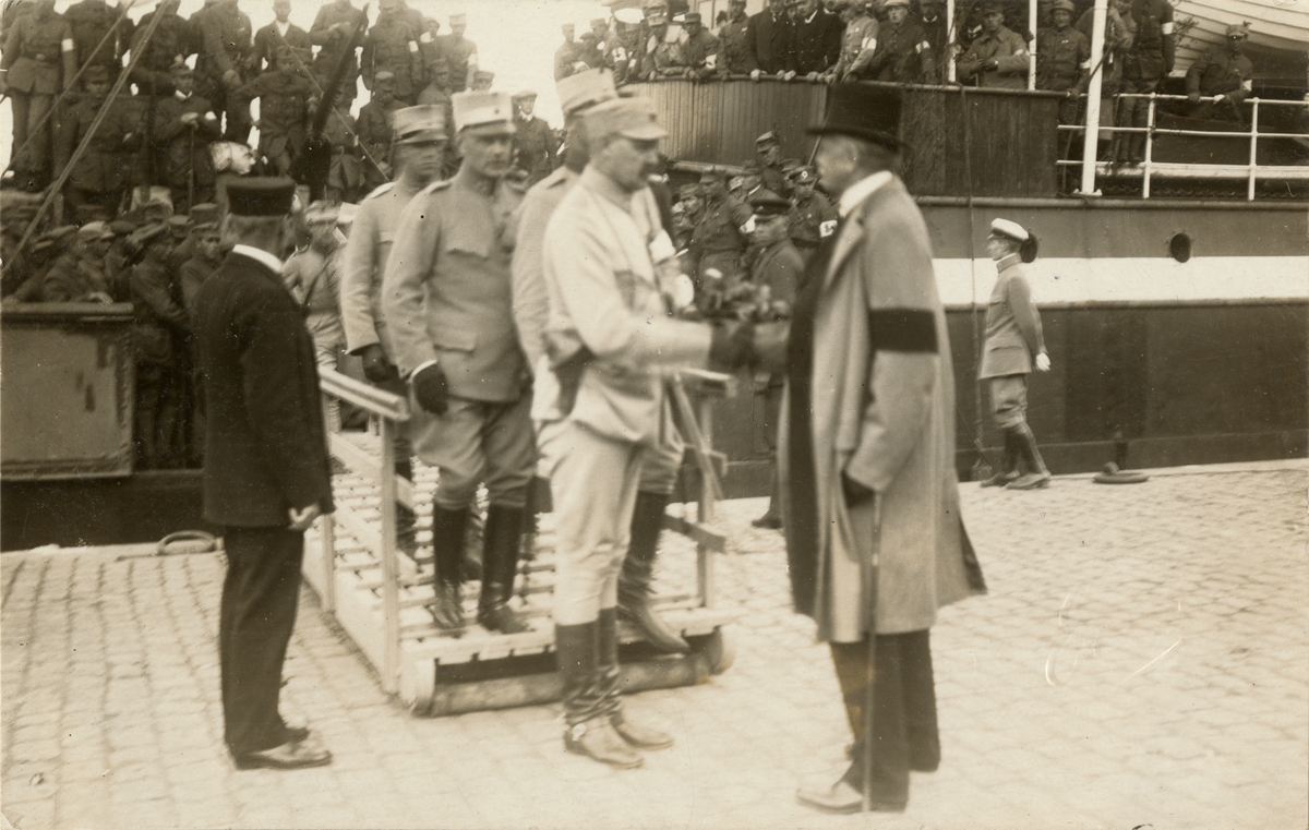 Text i fotoalbum: "General Hjalmarsson går i land, hälsas av dir. Palme, ordf. i "Finlands vänner".