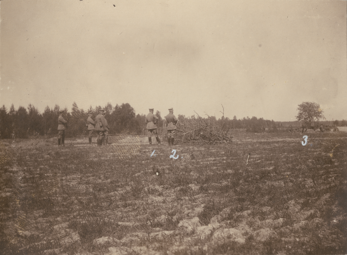 Text i fotoalbum: "Maj 1917. Besiktning af min stormgrupp vid Jaunsem-Zorndorf den 14 juni 1917. En af de många föröfningar för offensiven mot Riga i början på september 1917.