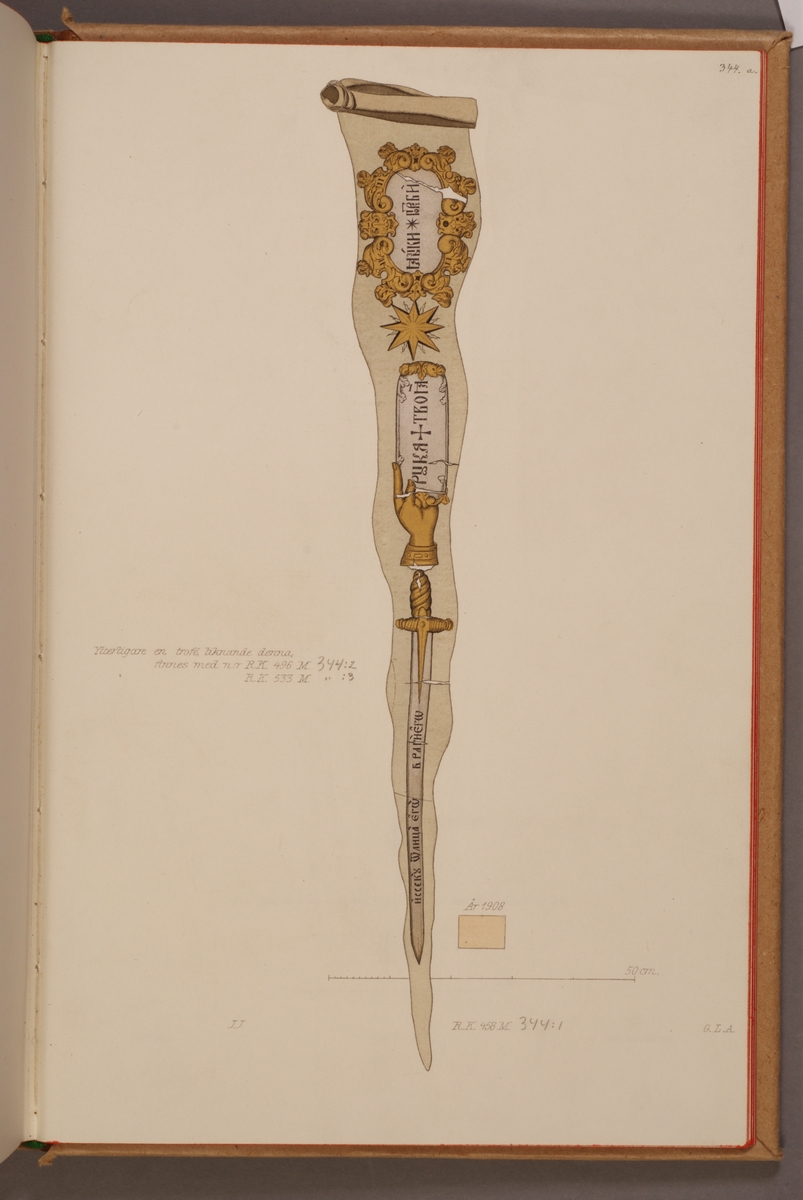 Avbildning i gouache föreställande fälttecken taget som trofé av svenska armén. Den avbildade vimpeln finns bevarad i Armémuseums samling, för mer information, se relaterade objekt.